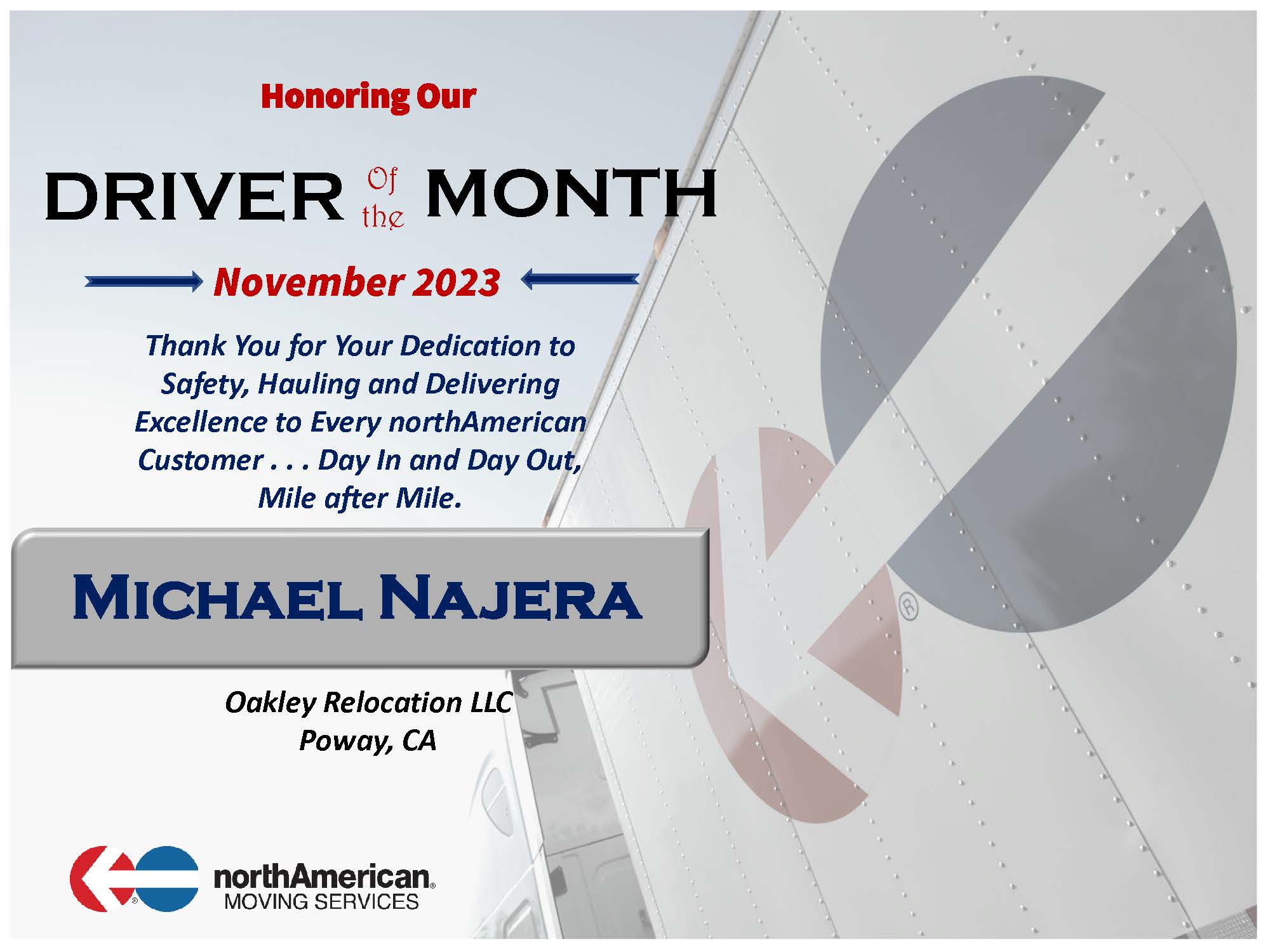 Oakley Relocation’s interstate driver, Michael Najera, is the North American Van Lines November 2023 Driver of the Month. Michael’s exceptional service to our customers, along with his excellent quality, safety and hauling record have earned him this prestigious award. We are proud of not just Michael, but our entire fleet or exceptional drivers who take care of our customers all year round.
