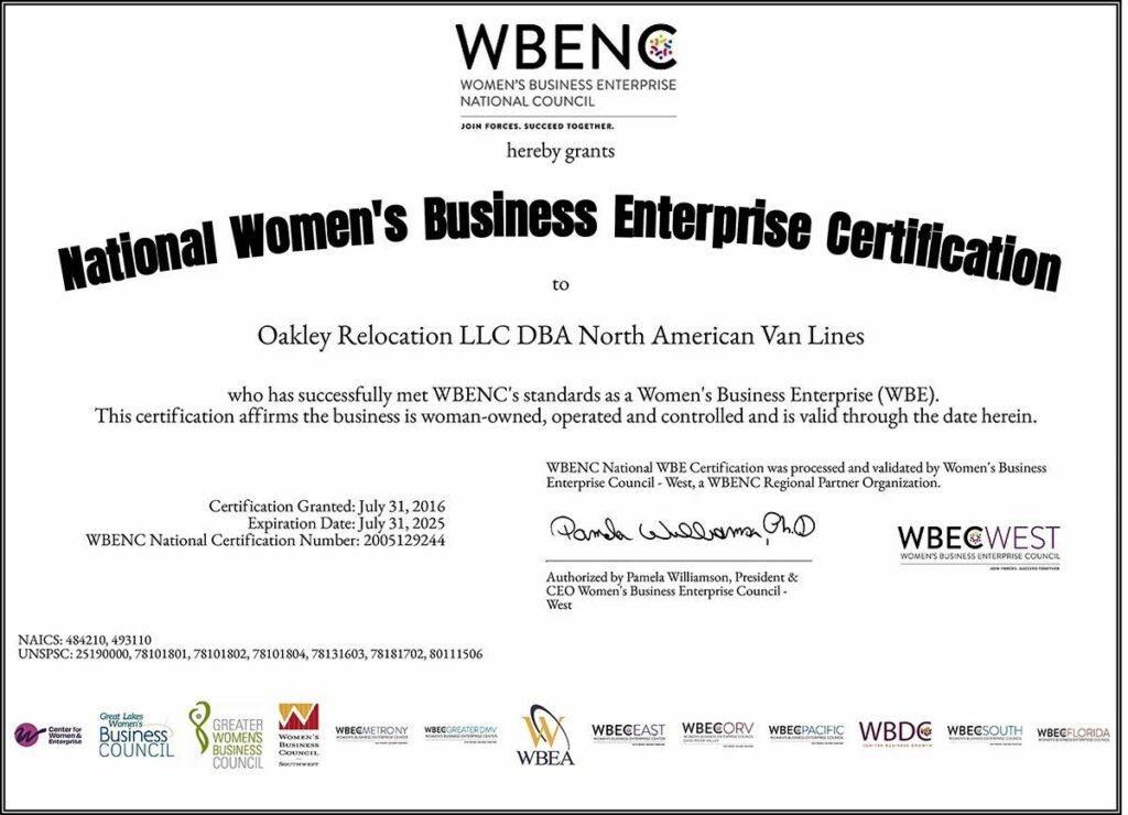 We are pleased to announce that Oakley Relocation LLC was re-certified for 2024 by Women’s Business Enterprise National Council (WBENC) as a women-owned business (WBE) and women-owned small business (WOSB). We are proud to be part of WBENC, the largest certifier of women-owned businesses in the United States and a leading advocate for women business owners and entrepreneurs.
